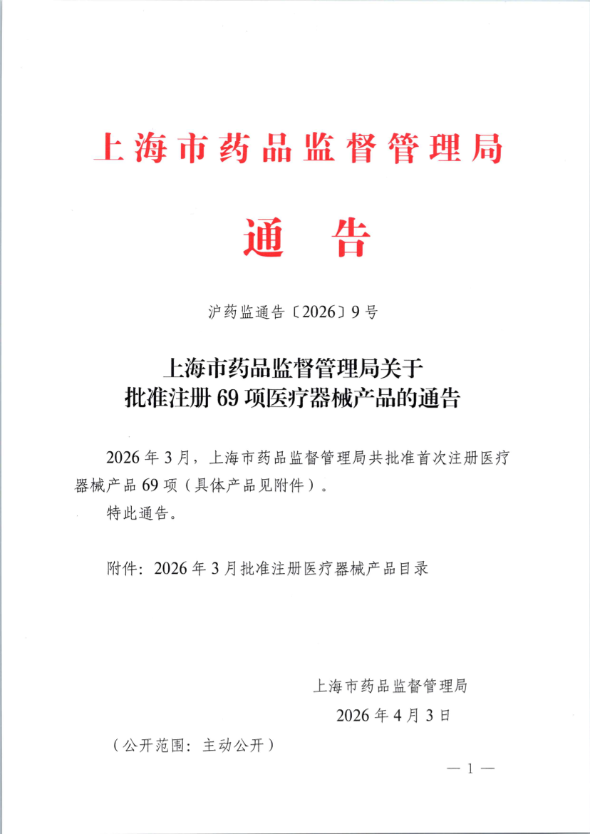2026年3月,上海市药品监督管理局共批准首次注册医疗器械产品69项(具体产品见附件)。