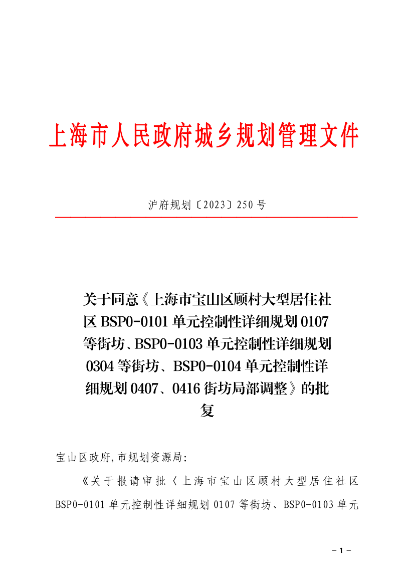 《关于报请审批〈上海市宝山区顾村大型居住社区BSP0-0101单元控制性详细规划0107等街坊、BSP0-0103单元控制性详细规划0304等街坊、BSP0-0104单元控制性详细规划0407、0416街坊局部调整〉的请示》(沪规划资源宝〔2023〕19号)收悉。经研究,原则同意上报规划内容。