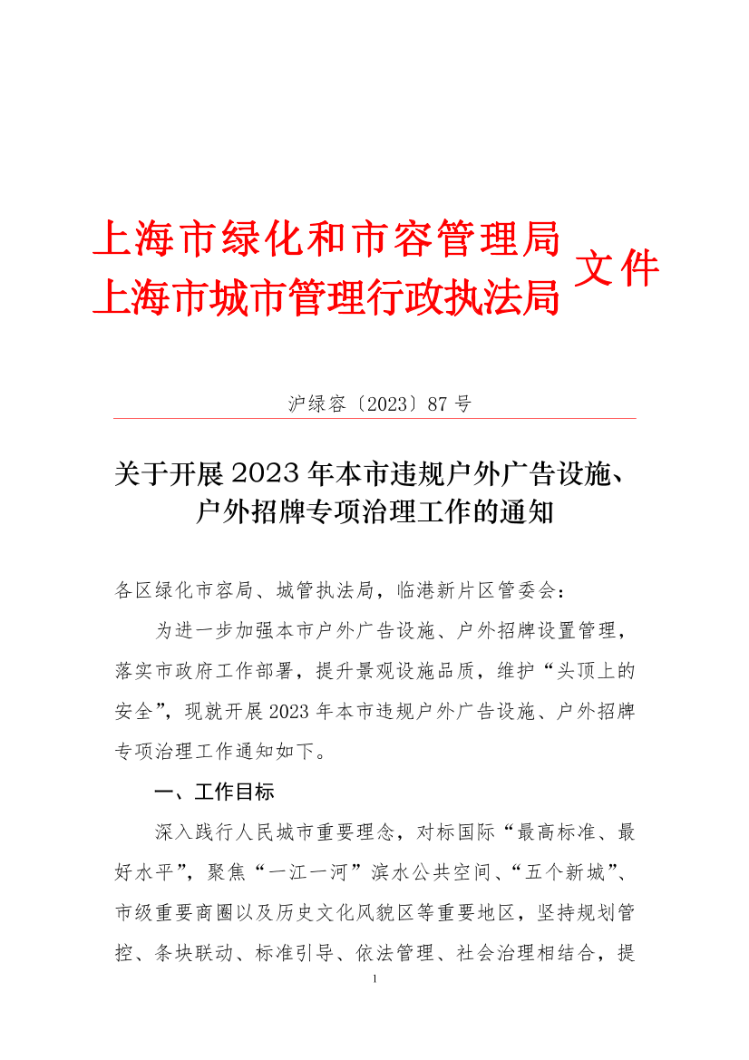 为进一步加强本市户外广告设施、户外招牌设置管理,落实市政府工作部署,提升景观设施品质,维护“头顶上的安全”,现就开展2023年本市违规户外广告设施、户外招牌专项治理工作通知如下。