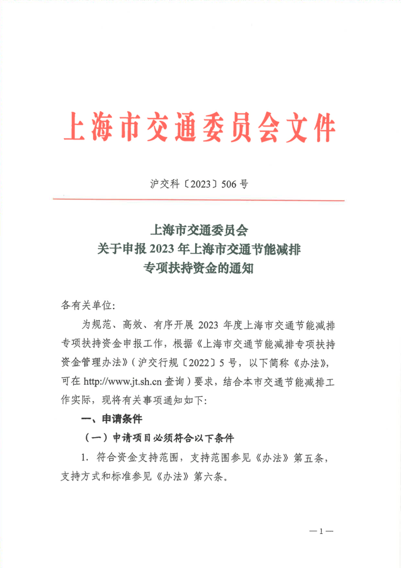 为规范、高效、有序开展2023年度上海市交通节能减排专项扶持资金申报工作,根据《上海市交通节能减排专项扶持资金管理办法》(沪交行规〔2022〕5号,以下简称《办法》,可在http://www.jt.sh.cn查询)要求,结合本市交通节能减排工作实际,现将有关事项通知如下: