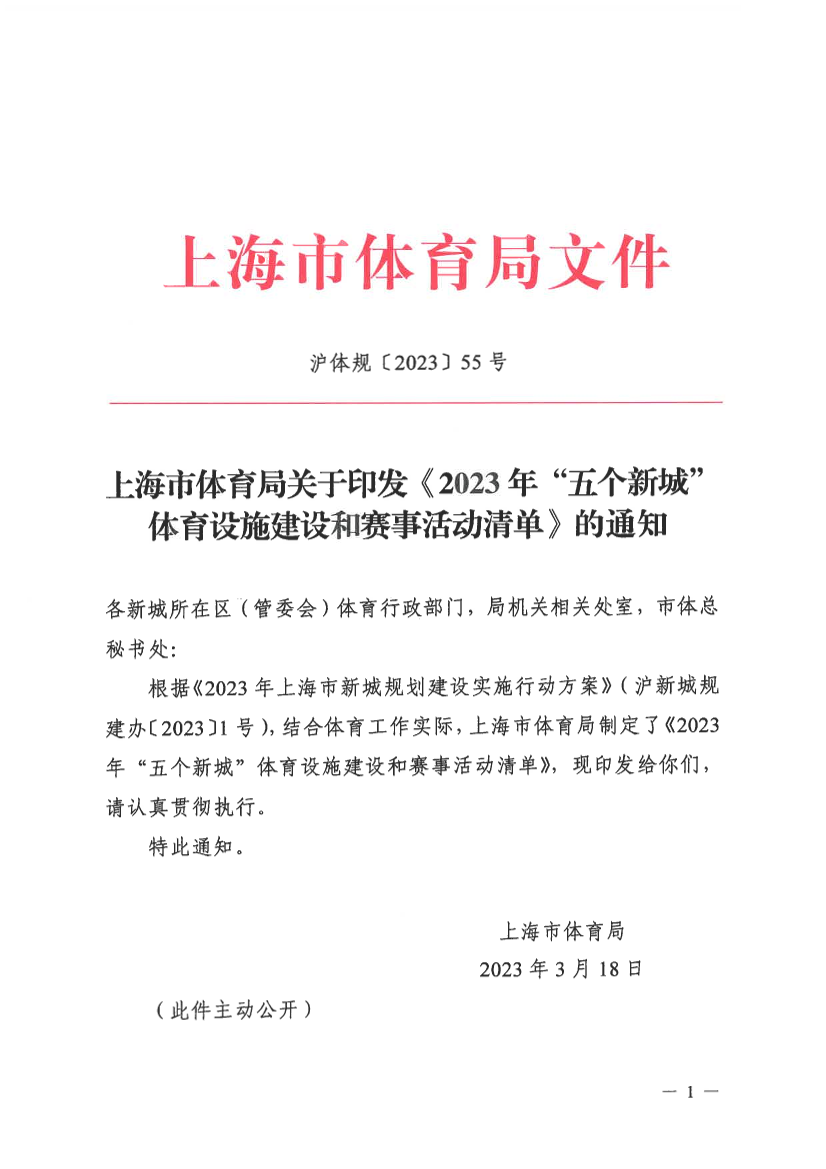 根据《2023年上海市新城规划建设实施行动方案》(沪新城规建办〔2023〕1号),结合体育工作实际,上海市体育局制定了《2023年“五个新城”体育设施建设和赛事活动清单》,现印发给你们,请认真贯彻执行。