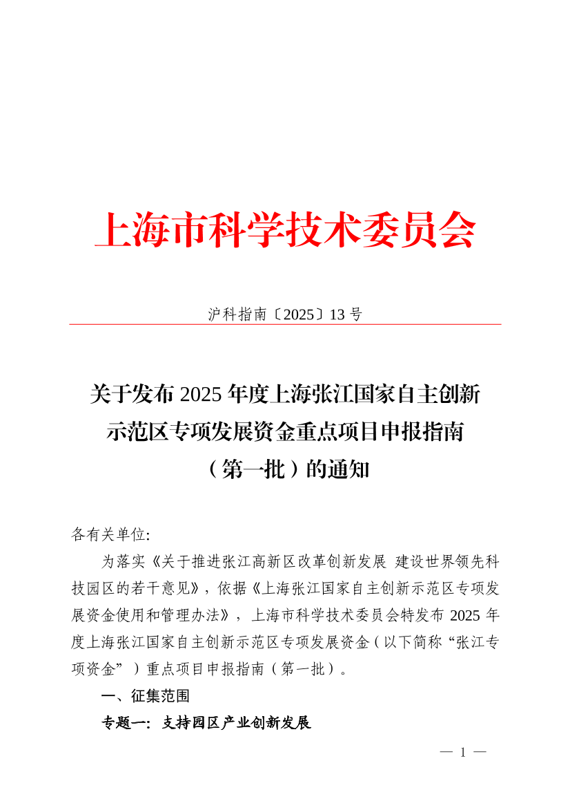 为落实《关于推进张江高新区改革创新发展建设世界领先科技园区的若干意见》,依据《上海张江国家自主创新示范区专项发展资金使用和管理办法》,上海市科学技术委员会特发布2025年度上海张江国家自主创新示范区专项发展资金(以下简称“张江专项资金”)重点项目申报指南(第一批)。
