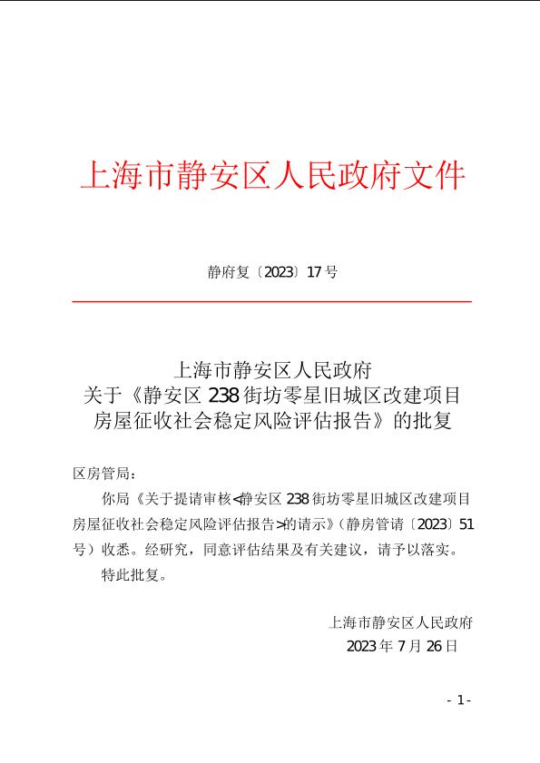 你局《关于提请审核<静安区238街坊零星旧城区改建项目房屋征收社会稳定风险评估报告>的请示》(静房管请〔2023〕51号)收悉。经研究,同意评估结果及有关建议,请予以落实。