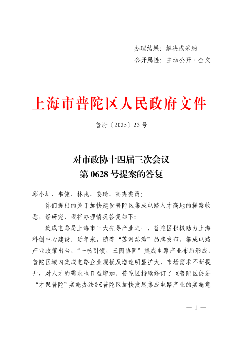 你们提出的关于加快建设普陀区集成电路人才高地的提案收悉,经研究,现将办理情况答复如下: