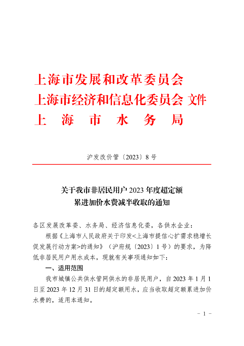 根据《上海市人民政府关于印发<上海市提信心扩需求稳增长促发展行动方案>的通知》(沪府规〔2023〕1号)的要求,为降低非居民用户用水成本,现就有关事项通知如下: