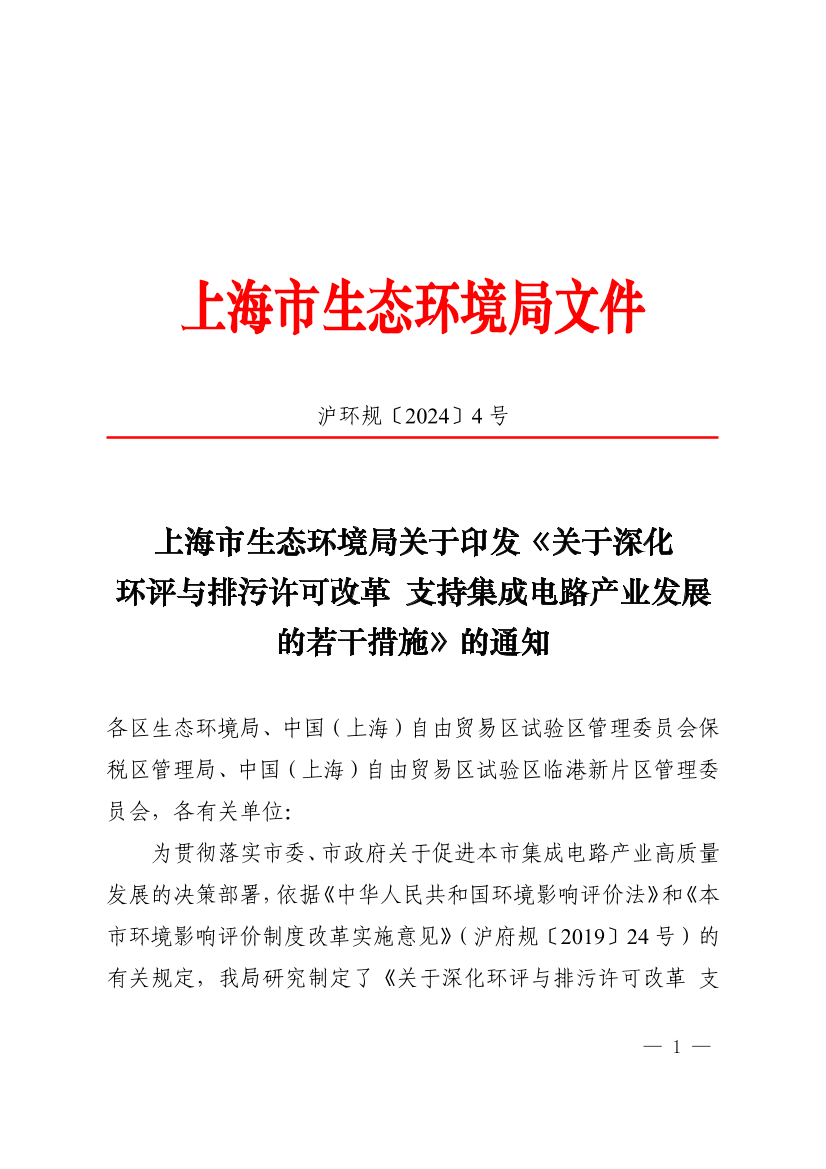 为贯彻落实市委、市政府关于促进本市集成电路产业高质量发展的决策部署,依据《中华人民共和国环境影响评价法》和《本市环境影响评价制度改革实施意见》(沪府规〔2019〕24号)的有关规定,我局研究制定了《关于深化环评与排污许可改革 支持集成电路产业发展的若干措施》,现印发给你们,请认真按照执行。