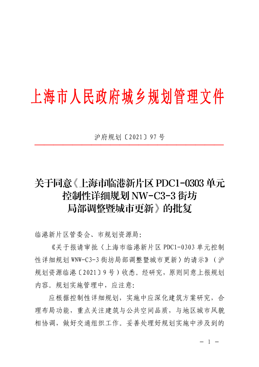 《关于报请审批〈上海市临港新片区PDC1-0303单元控制性详细规划WNW-C3-3街坊局部调整暨城市更新〉的请示》(沪规划资源临港〔2021〕9号)收悉。经研究,原则同意上报规划内容。规划实施管理中,应注意: