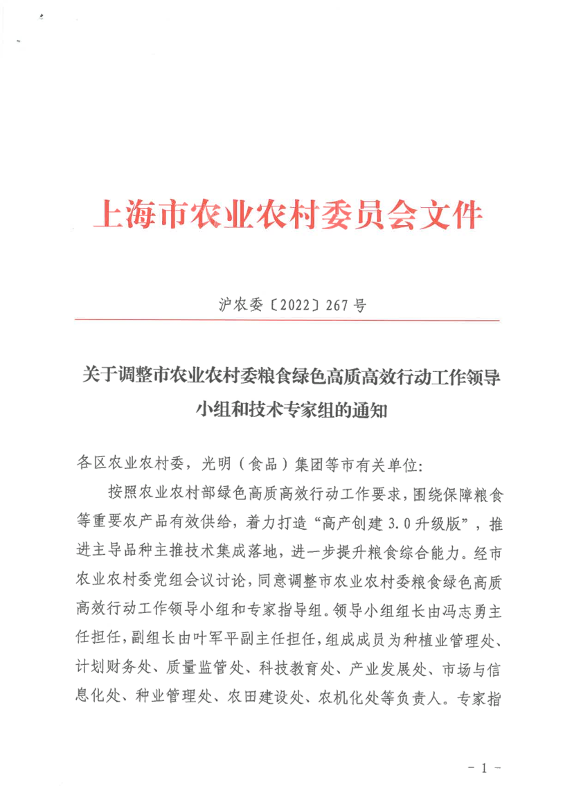 按照农业农村部绿色高质高效行动工作要求,围绕保障粮食等重要农产品有效供给,着力打造“高产创建3.0升级版”,推进主导品种主推技术集成落地,进一步提升粮食综合能力。经市农业农村委党组会议讨论,同意调整市农业农村委粮食绿色高质高效行动工作领导小组和专家指导组。领导小组组长由冯志勇主任担任,副组长由叶军平副主任担任,组成成员为种植业管理处、计划财务处、质量监管处、科技教育处、产业发展处、市场与信息化处、种业管理处、农田建设处、农机化处等负责人。专家指导组由市农技中心牵头,专家组组长由市农技中心朱建华主任担任,副组长由市农科院作物所曹黎明所长、市农技中心分管主任担任,成员由市农技中心、市农科院、市农产品质量安全中心、上海交通大学等有关专家组成。具体如下: