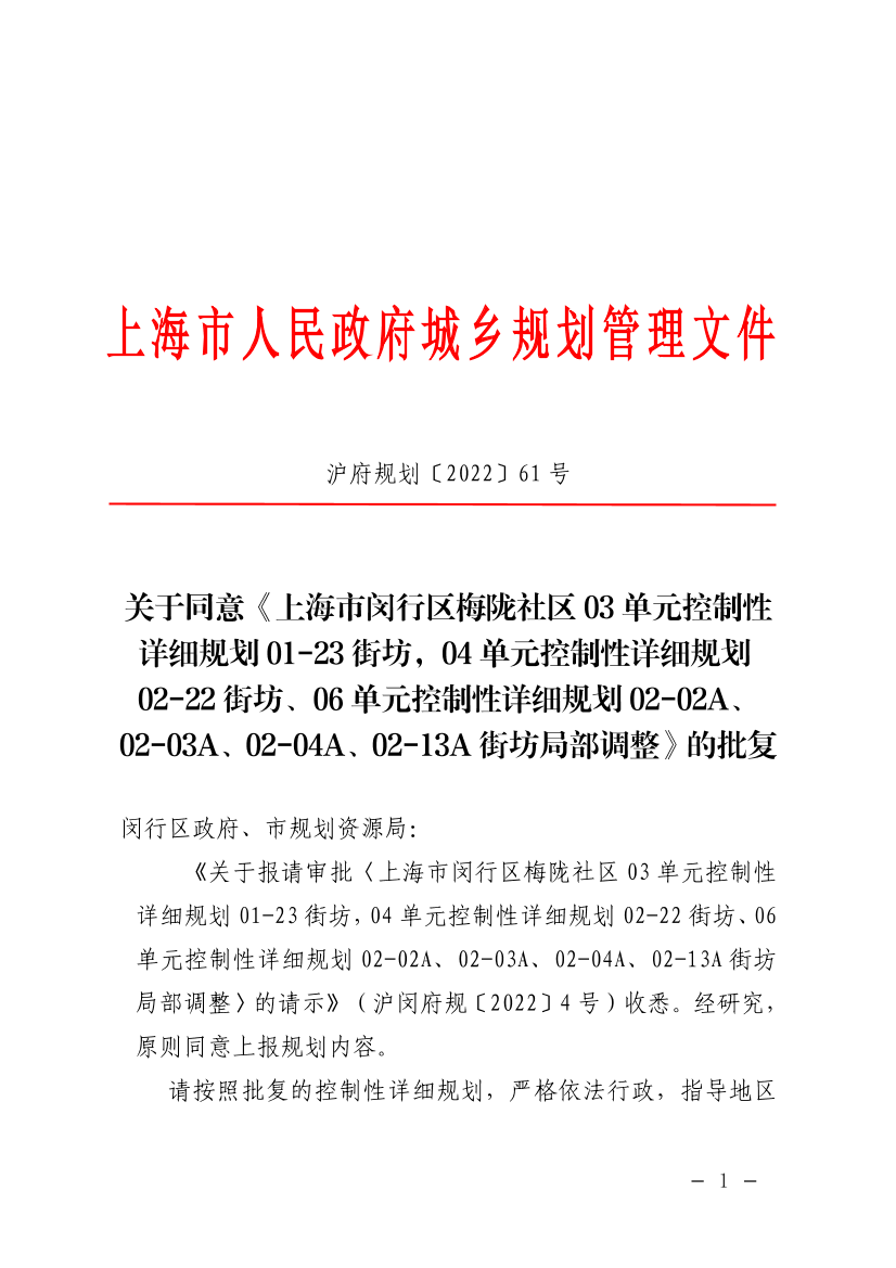 《关于报请审批〈上海市闵行区梅陇社区03单元控制性详细规划01-23街坊,04单元控制性详细规划02-22街坊、06单元控制性详细规划02-02A、02-03A、02-04A、02-13A街坊局部调整〉的请示》(沪闵府规〔2022〕4号)收悉。经研究,原则同意上报规划内容。