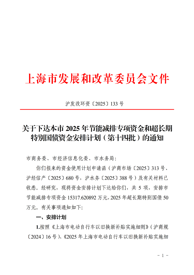 1.按照《上海市电动自行车以旧换新补贴实施细则》(沪商规〔2024〕16号)、《2025年上海市电动自行车以旧换新补贴实施细则》(沪商市场〔2025〕212号)规定,安排经审核通过的2025年第七批34423辆电动自行车以旧换新补贴资金,由市节能减排专项资金安排1983.42万元、2025年超长期特别国债安排50万元,合计2033.42万元。