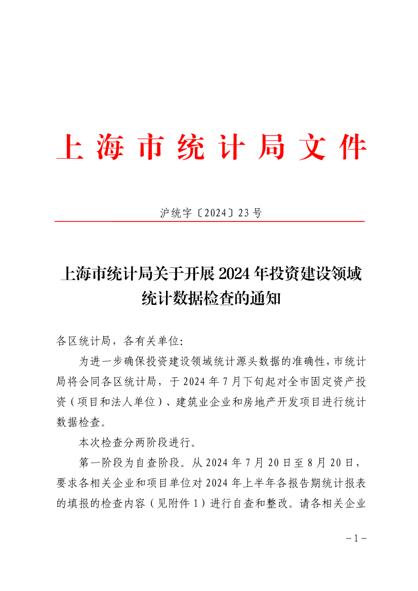 为进一步确保投资建设领域统计源头数据的准确性,市统计局将会同各区统计局,于2024年7月下旬起对全市固定资产投资(项目和法人单位)、建筑业企业和房地产开发项目进行统计数据检查。