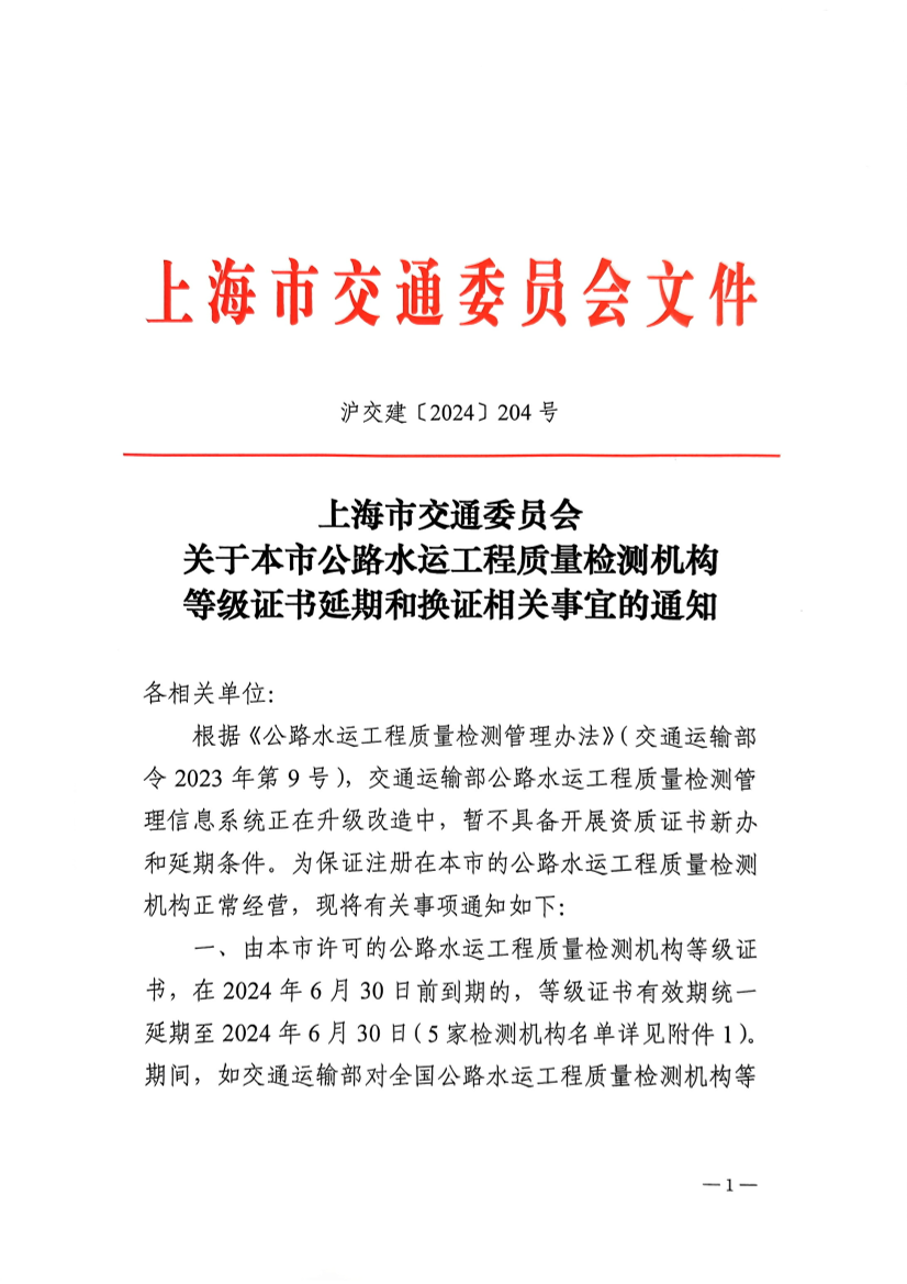 一、由本市许可的公路水运工程质量检测机构等级证书,在2024年6月30日前到期的,等级证书有效期统一延期至2024年6月30日(5家检测机构名单详见附件1)。期间,如交通运输部对全国公路水运工程质量检测机构等级证书有效期有新规定的,按交通运输部规定执行。