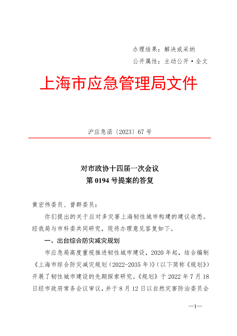 你们提出的关于应对多灾害上海韧性城市构建的建议收悉。经我局与市科委共同研究,现将办理意见答复如下。