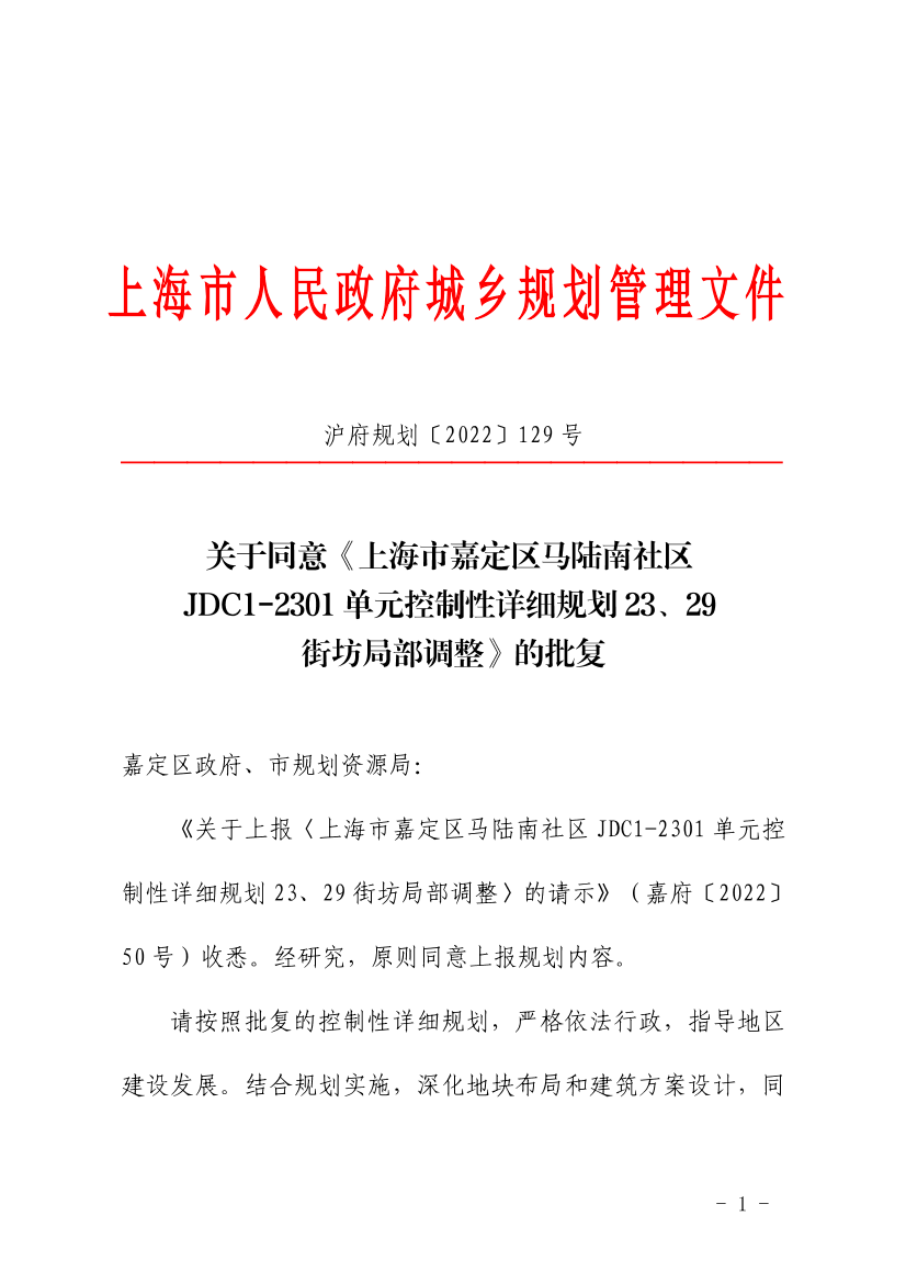 《关于上报〈上海市嘉定区马陆南社区JDC1-2301单元控制性详细规划23、29街坊局部调整〉的请示》(嘉府〔2022〕50号)收悉。经研究,原则同意上报规划内容。