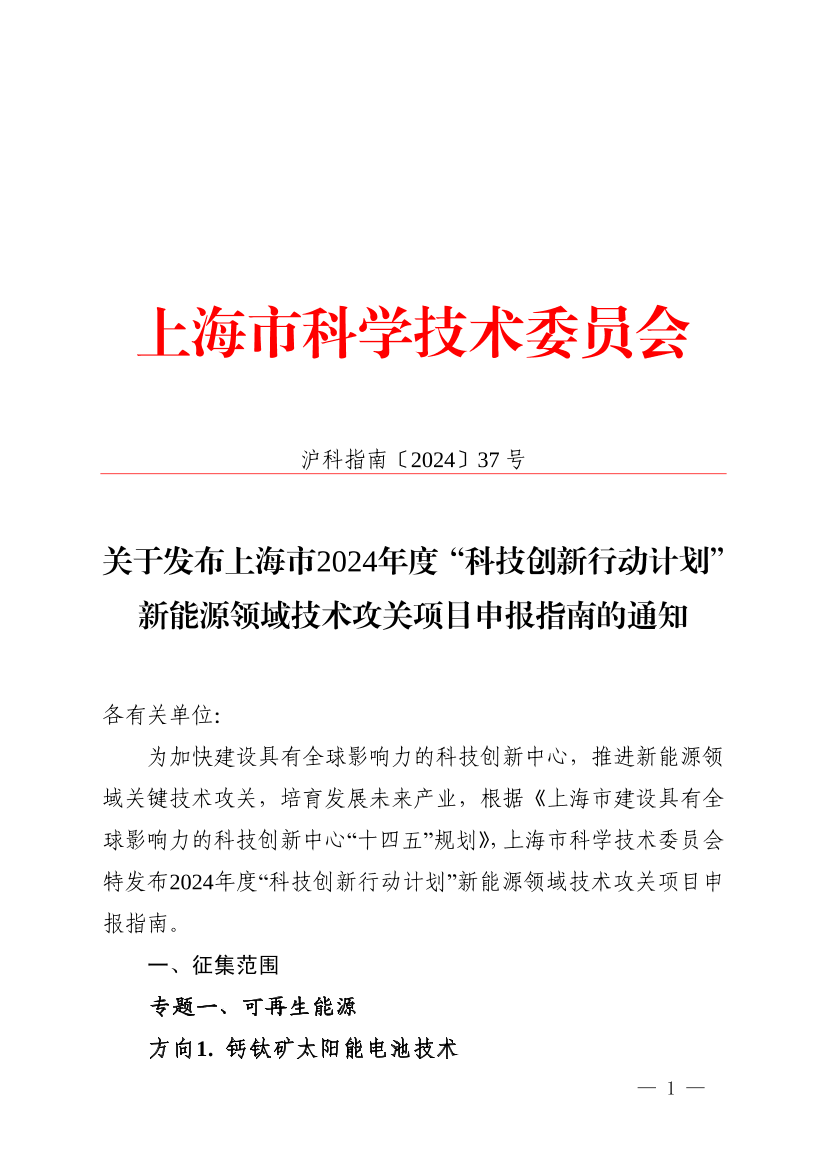 为加快建设具有全球影响力的科技创新中心,推进新能源领域关键技术攻关,培育发展未来产业,根据《上海市建设具有全球影响力的科技创新中心“十四五”规划》,上海市科学技术委员会特发布2024年度“科技创新行动计划”新能源领域技术攻关项目申报指南。