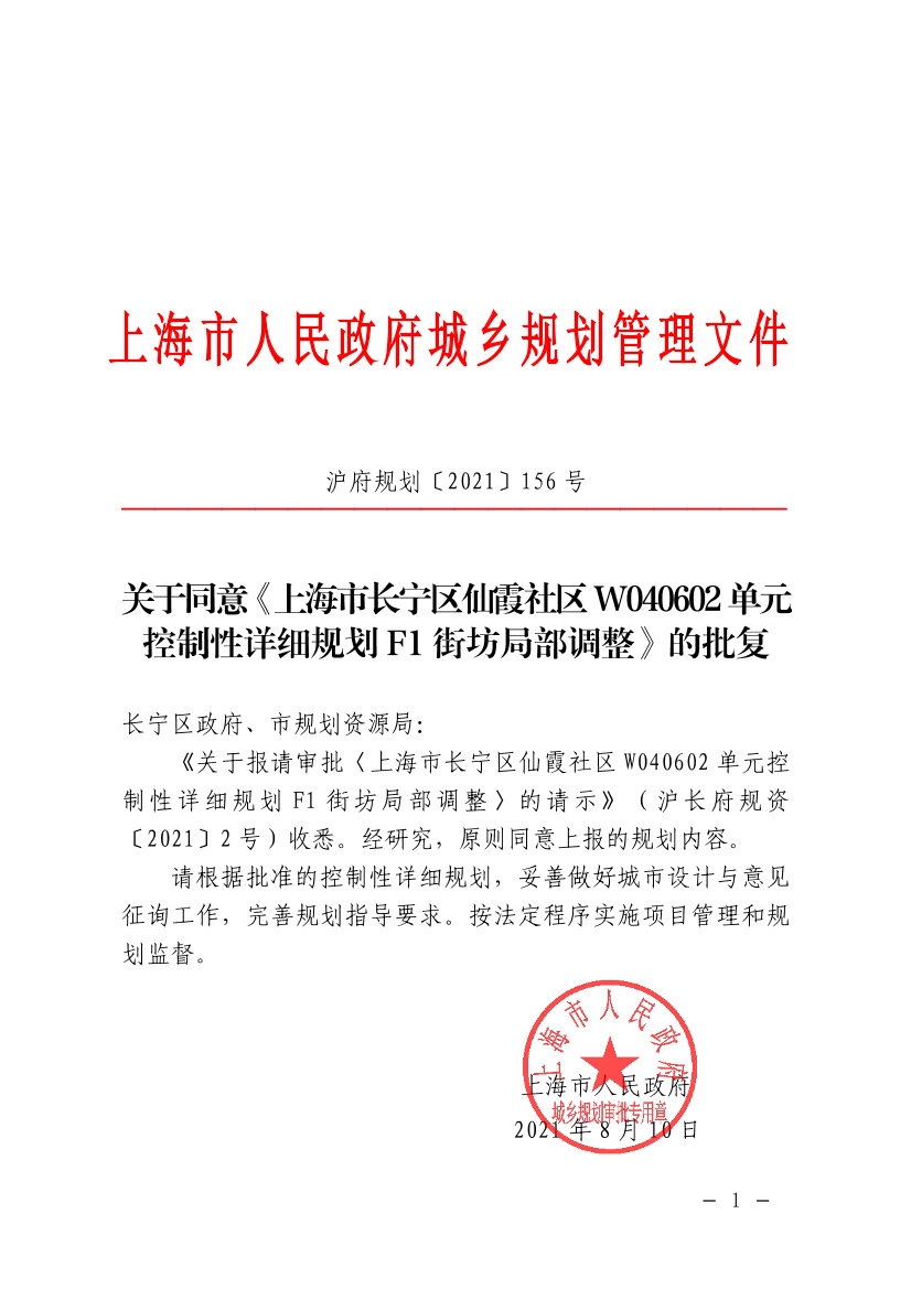 《关于报请审批〈上海市长宁区仙霞社区W040602单元控制性详细规划F1街坊局部调整〉的请示》(沪长府规资〔2021〕2号)收悉。经研究,原则同意上报的规划内容。