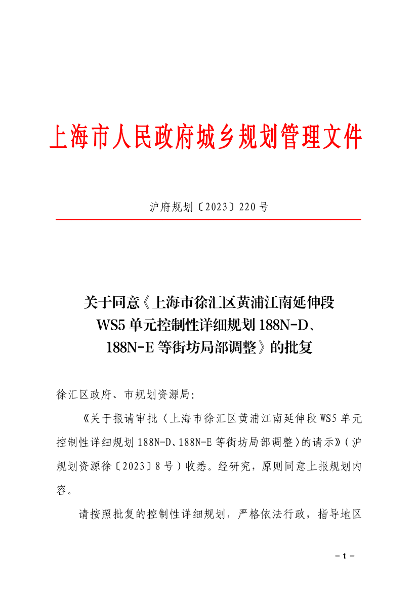 《关于报请审批〈上海市徐汇区黄浦江南延伸段WS5单元控制性详细规划188N-D、188N-E等街坊局部调整〉的请示》(沪规划资源徐〔2023〕8号)收悉。经研究,原则同意上报规划内容。