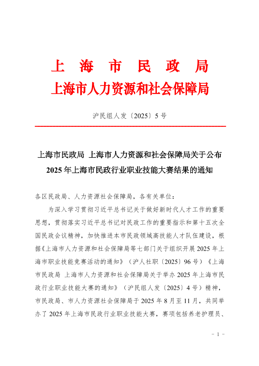 为深入学习贯彻习近平总书记关于做好新时代人才工作的重要思想,贯彻落实习近平总书记对民政工作的重要指示和第十五次全国民政会议精神,加快推进本市民政领域高技能人才队伍建设,根据《上海市人力资源和社会保障局等七部门关于组织开展2025年上海市职业技能竞赛活动的通知》(沪人社职〔2025〕96号)《上海市民政局 上海市人力资源和社会保障局关于举办2025年上海市民政行业职业技能大赛的通知》(沪民组人发〔2025〕4号)精神,市民政局、市人力资源社会保障局于2025年8月至11月,共同举办了2025年上海市民政行业职业技能大赛,赛项包括养老护理员、孤残儿童护理员、遗体防腐整容师(遗体防腐师)、殡仪服务员(殡葬礼仪师)、康复辅助技术咨询师、婚姻登记(颁证)员。