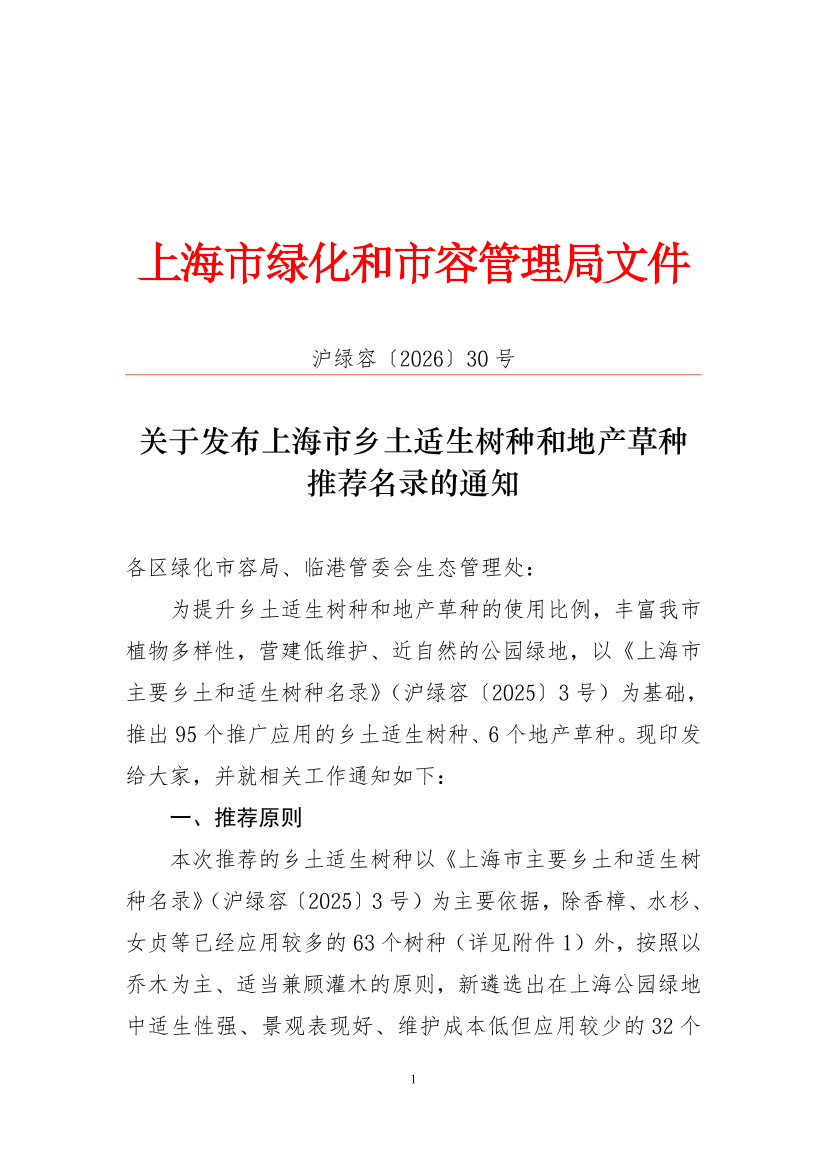 为提升乡土适生树种和地产草种的使用比例,丰富我市植物多样性,营建低维护、近自然的公园绿地,以《上海市主要乡土和适生树种名录》(沪绿容〔2025〕3号)为基础,推出95个推广应用的乡土适生树种、6个地产草种。现印发给大家,并就相关工作通知如下: