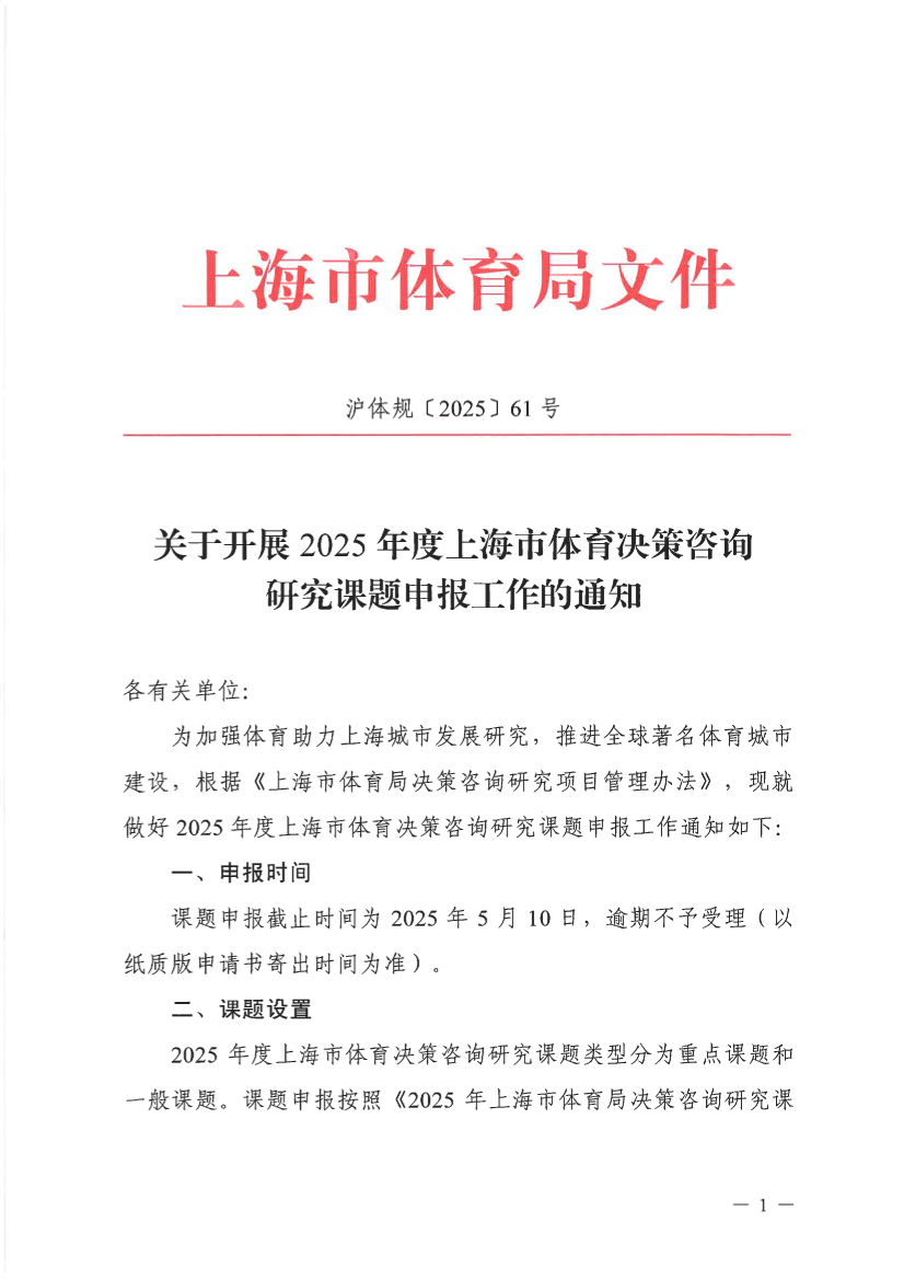 为加强体育助力上海城市发展研究,推进全球著名体育城市建设,根据《上海市体育局决策咨询研究项目管理办法》,现就做好2025年度上海市体育决策咨询研究课题申报工作通知如下: