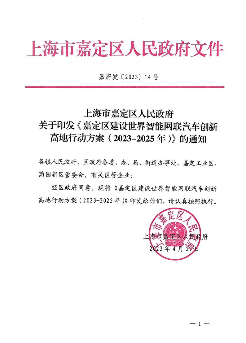 经区政府同意,现将《嘉定区建设世界智能网联汽车创新高地行动方案(2023-2025年)》印发给你们,请认真按照执行。