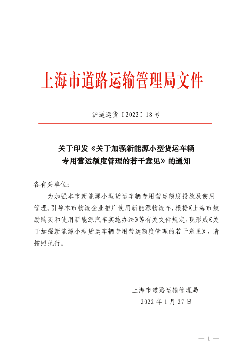 为加强本市新能源小型货运车辆专用营运额度投放及使用管理,引导本市道路运输企业推广使用新能源物流车, 根据《上海市鼓励购买和使用新能源汽车实施办法》《上海市道路运输管理条例》等文件规定,现提出如下意见: