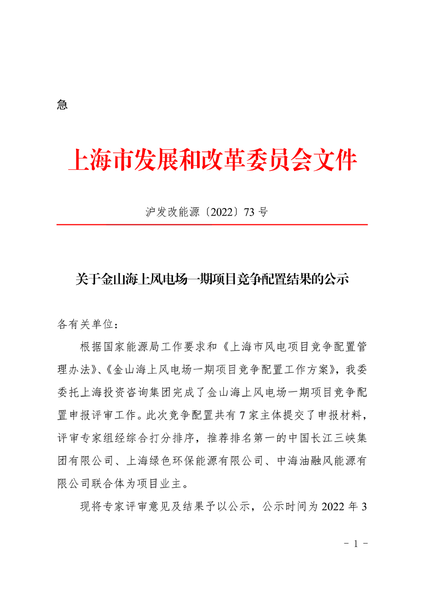 根据国家能源局工作要求和《上海市风电项目竞争配置管理办法》、《金山海上风电场一期项目竞争配置工作方案》,我委委托上海投资咨询集团完成了金山海上风电场一期项目竞争配置申报评审工作。此次竞争配置共有7家主体提交了申报材料,评审专家组经综合打分排序,推荐排名第一的中国长江三峡集团有限公司、上海绿色环保能源有限公司、中海油融风能源有限公司联合体为项目业主。