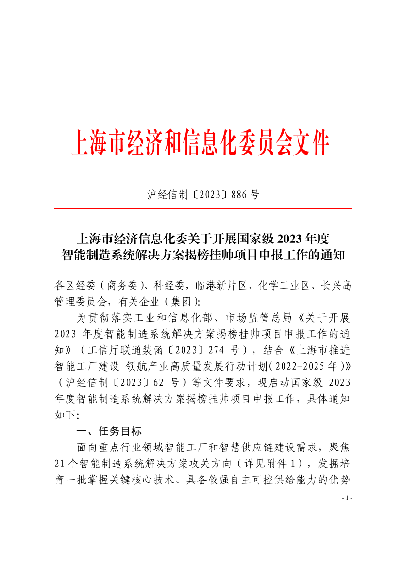 为贯彻落实工业和信息化部、市场监管总局《关于开展2023年度智能制造系统解决方案揭榜挂帅项目申报工作的通知》(工信厅联通装函〔2023〕274号),结合《上海市推进智能工厂建设 领航产业高质量发展行动计划(2022-2025年)》(沪经信制〔2023〕62号)等文件要求,现启动国家级2023年度智能制造系统解决方案揭榜挂帅项目申报工作,具体通知如下: