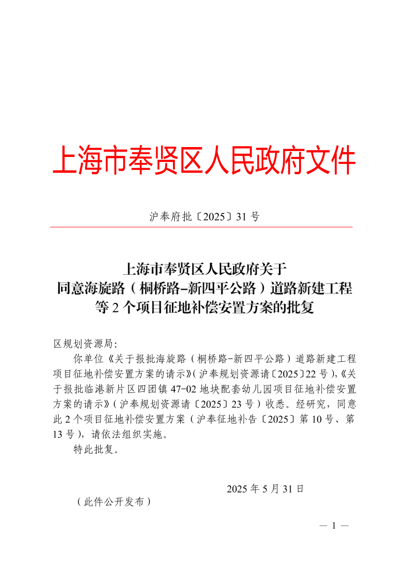 你单位《关于报批海旋路(桐桥路-新四平公路)道路新建工程项目征地补偿安置方案的请示》(沪奉规划资源请〔2025〕22号),《关于报批临港新片区四团镇47-02地块配套幼儿园项目征地补偿安置方案的请示》(沪奉规划资源请〔2025〕23号)收悉。经研究,同意此2个项目征地补偿安置方案(沪奉征地补告〔2025〕第10号、第13号),请依法组织实施。