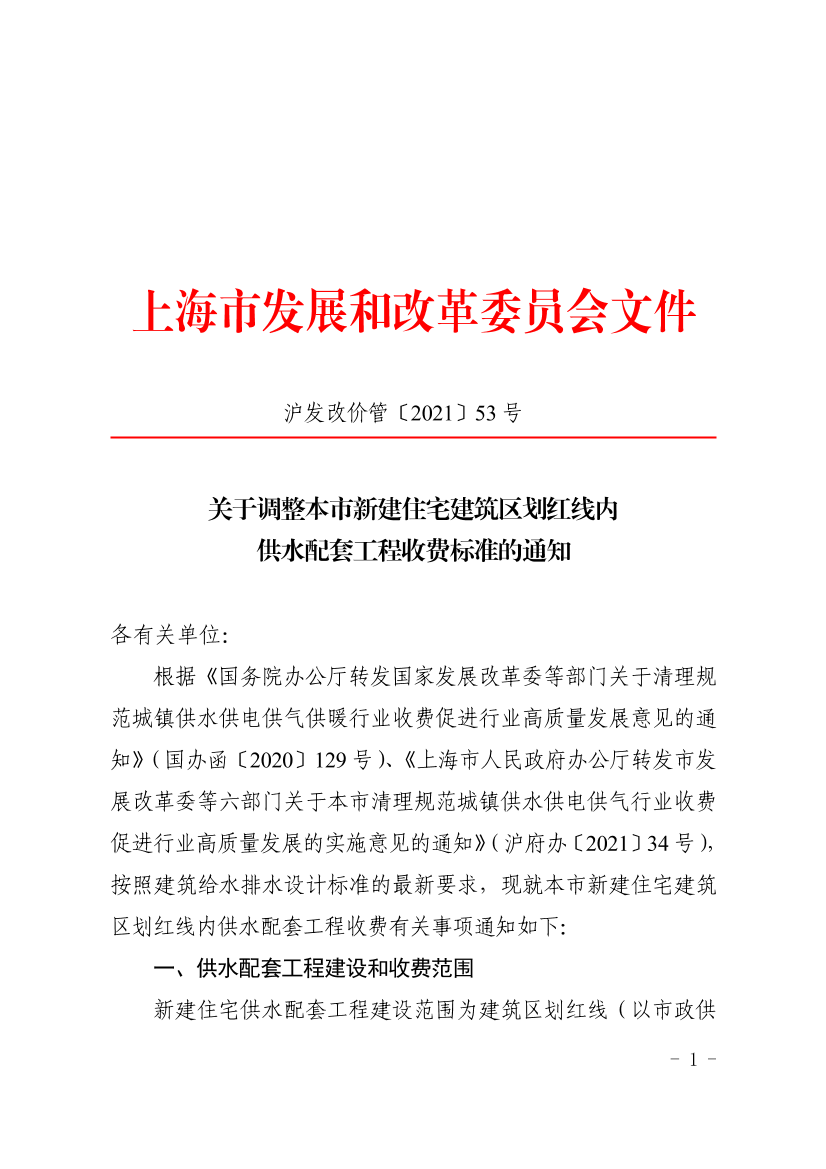 根据《国务院办公厅转发国家发展改革委等部门关于清理规范城镇供水供电供气供暖行业收费促进行业高质量发展意见的通知》(国办函〔2020〕129号)、《上海市人民政府办公厅转发市发展改革委等六部门关于本市清理规范城镇供水供电供气行业收费促进行业高质量发展的实施意见的通知》(沪府办〔2021〕34号),按照建筑给水排水设计标准的最新要求,现就本市新建住宅建筑区划红线内供水配套工程收费有关事项通知如下: