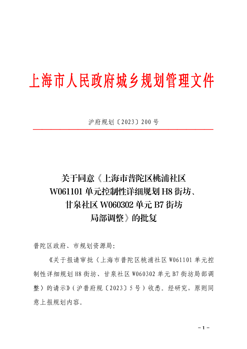 《关于报请审批〈上海市普陀区桃浦社区W061101单元控制性详细规划H8街坊、甘泉社区W060302单元B7街坊局部调整〉的请示》(沪普府规〔2023〕5号)收悉。经研究,原则同意上报规划内容。