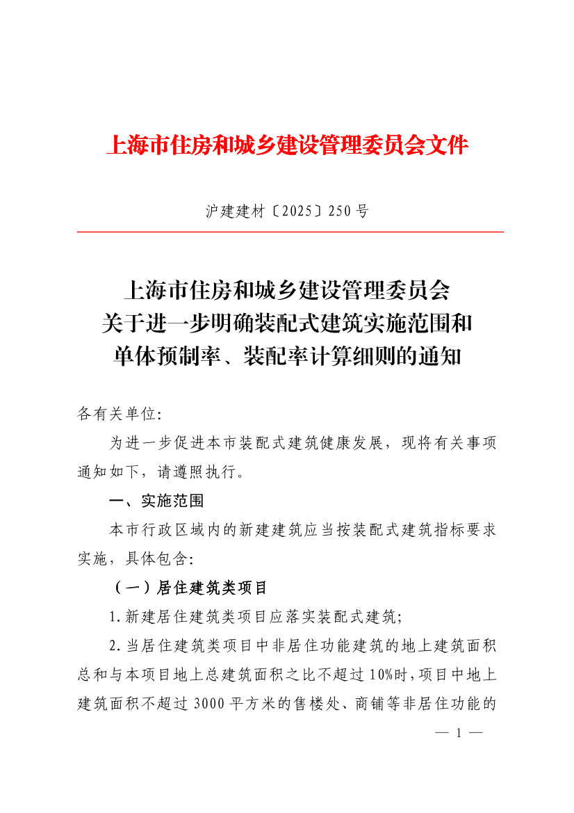 关于进一步明确装配式建筑实施范围和单体预制率、装配率计算细则的通知