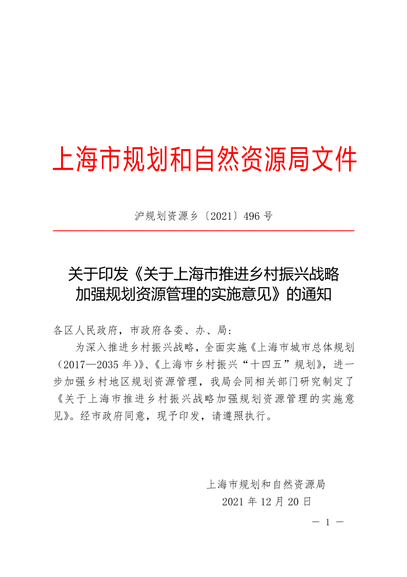 为深入推进乡村振兴战略,全面实施《上海市城市总体规划(2017—2035年)》、《上海市乡村振兴“十四五”规划》,进一步加强乡村地区规划资源管理,我局会同相关部门研究制定了《关于上海市推进乡村振兴战略加强规划资源管理的实施意见》。经市政府同意,现予印发,请遵照执行。
