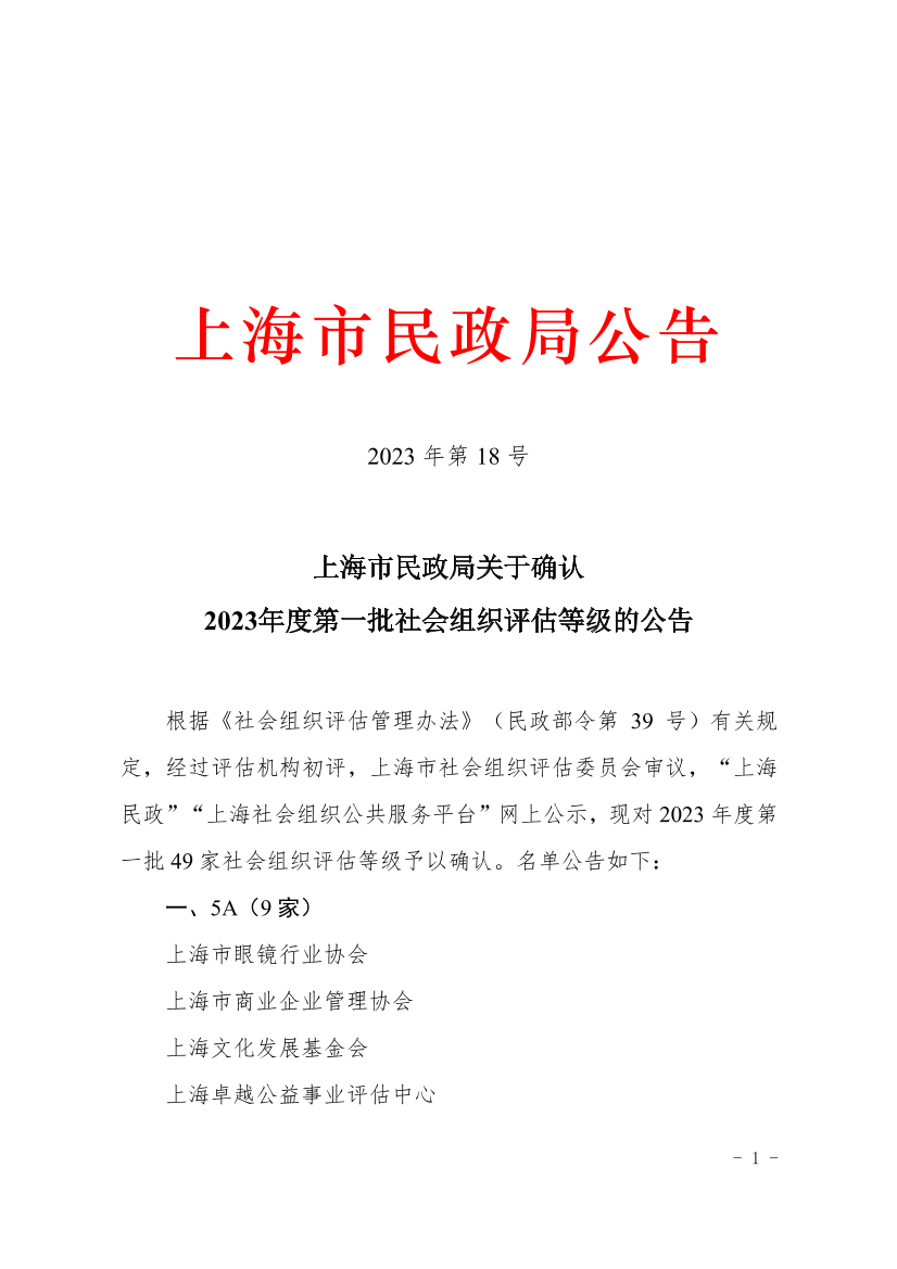 根据《社会组织评估管理办法》(民政部令第 39 号)有关规定,经过评估机构初评,上海市社会组织评估委员会审议,“上海民政”“上海社会组织公共服务平台”网上公示,现对2023年度第一批49家社会组织评估等级予以确认。名单公告如下: