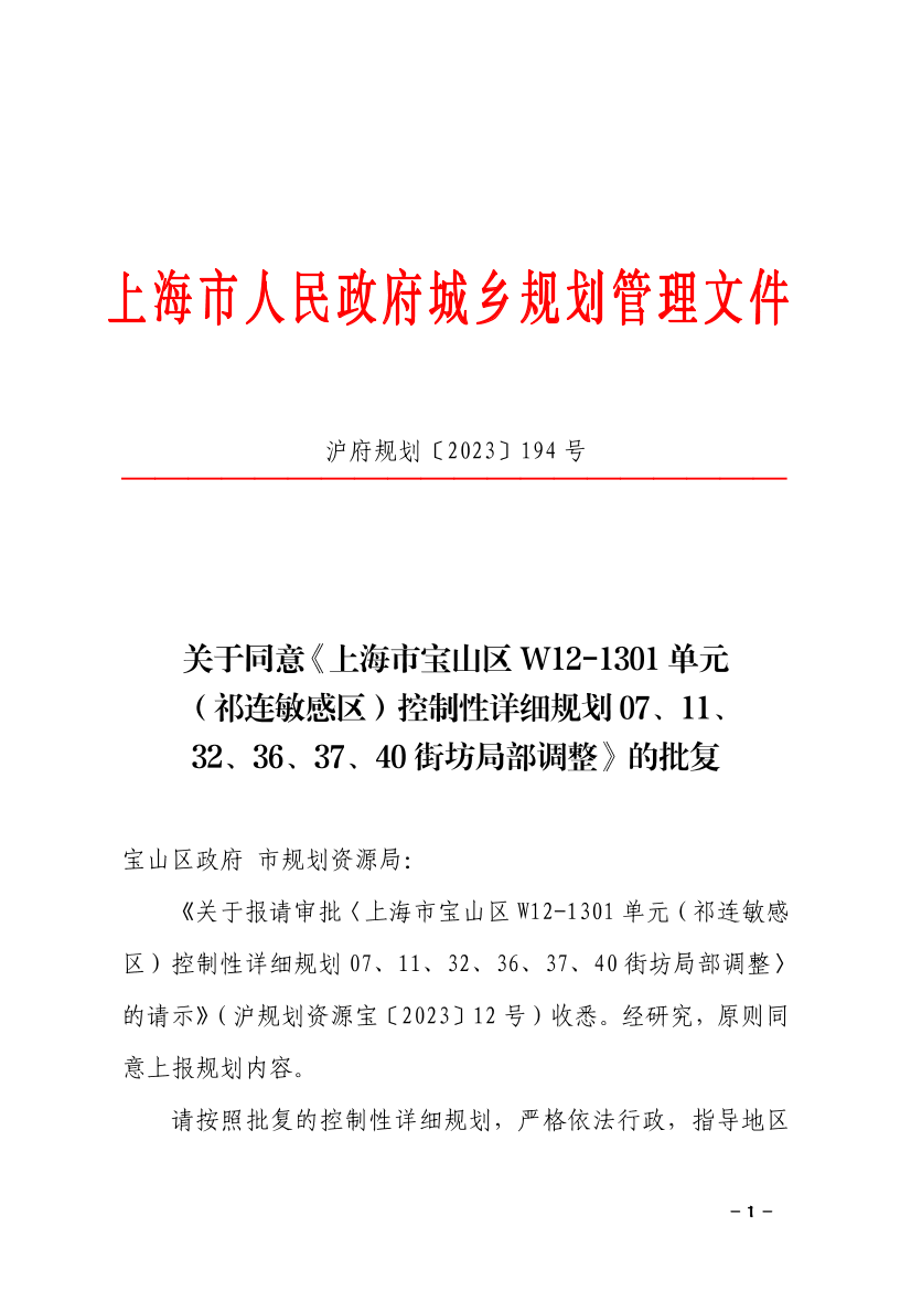 《关于报请审批〈上海市宝山区W12-1301单元(祁连敏感区)控制性详细规划07、11、32、36、37、40街坊局部调整〉的请示》(沪规划资源宝〔2023〕12号)收悉。经研究,原则同意上报规划内容。