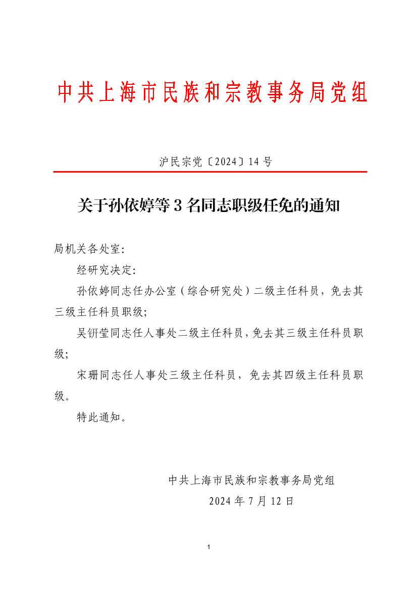 孙依婷同志任办公室(综合研究处)二级主任科员,免去其三级主任科员职级;