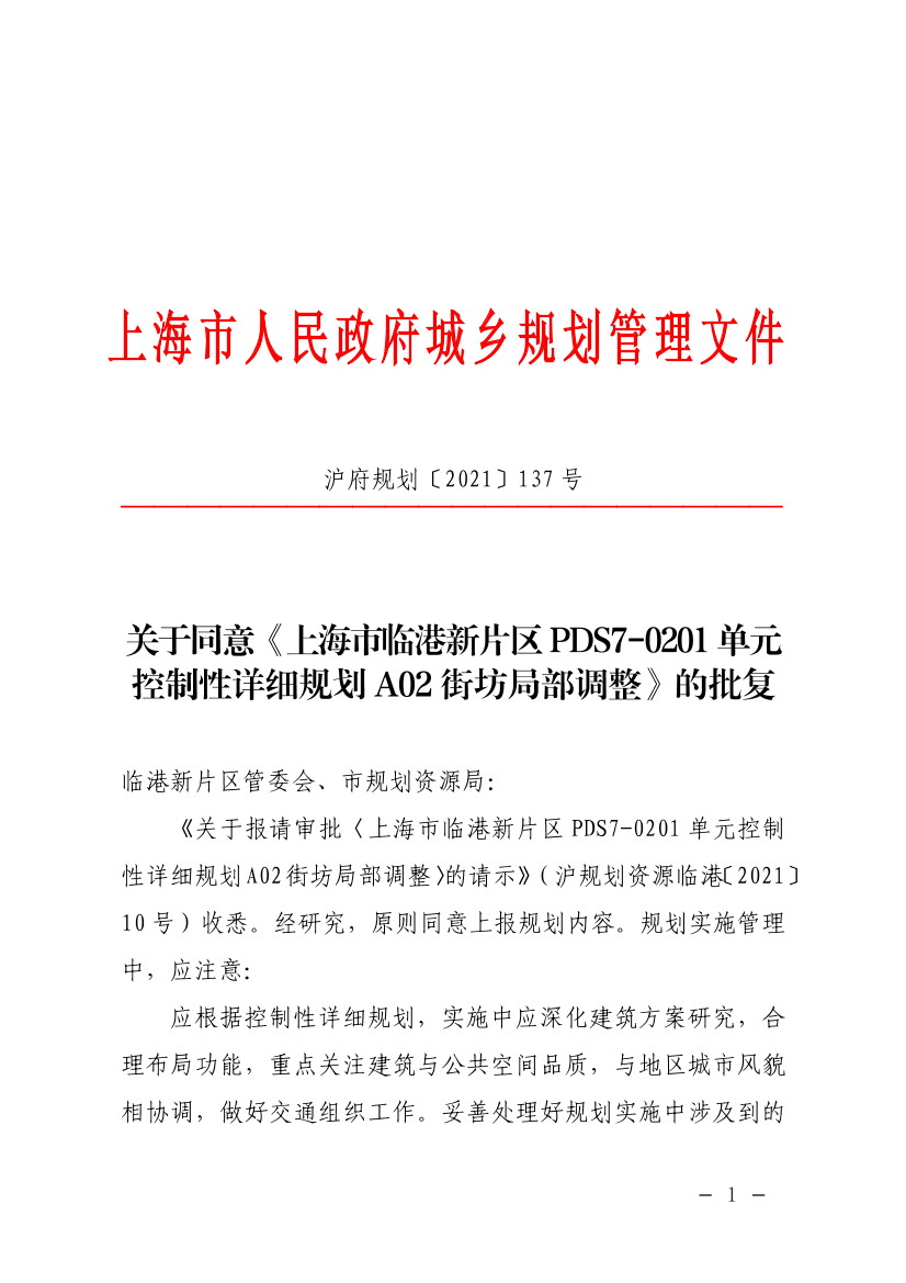 《关于报请审批〈上海市临港新片区PDS7-0201单元控制性详细规划A02街坊局部调整〉的请示》(沪规划资源临港〔2021〕10号)收悉。经研究,原则同意上报规划内容。规划实施管理中,应注意: