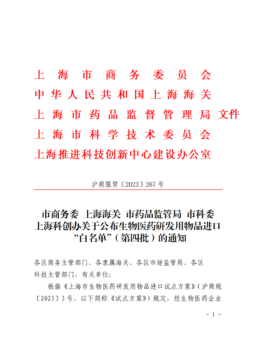 根据《上海市生物医药研发用物品进口试点方案》(沪商规〔2023〕3号,以下简称《试点方案》)规定,经生物医药企业(研发机构)申报,区域生物医药研发用物品进口试点联合推进机制推荐,市级生物医药研发用物品进口试点联合推进机制认定,现公布生物医药研发用物品进口“白名单”(第四批)。