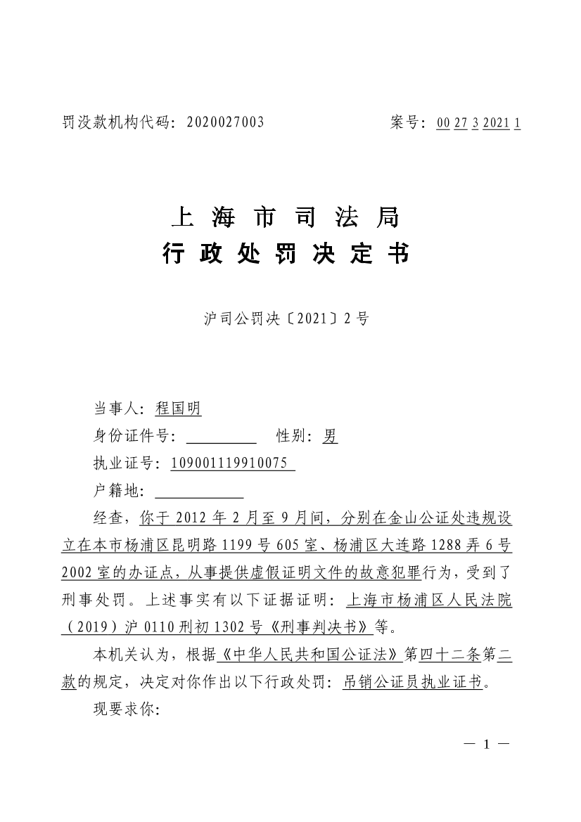 沪司公罚决〔2021〕2号