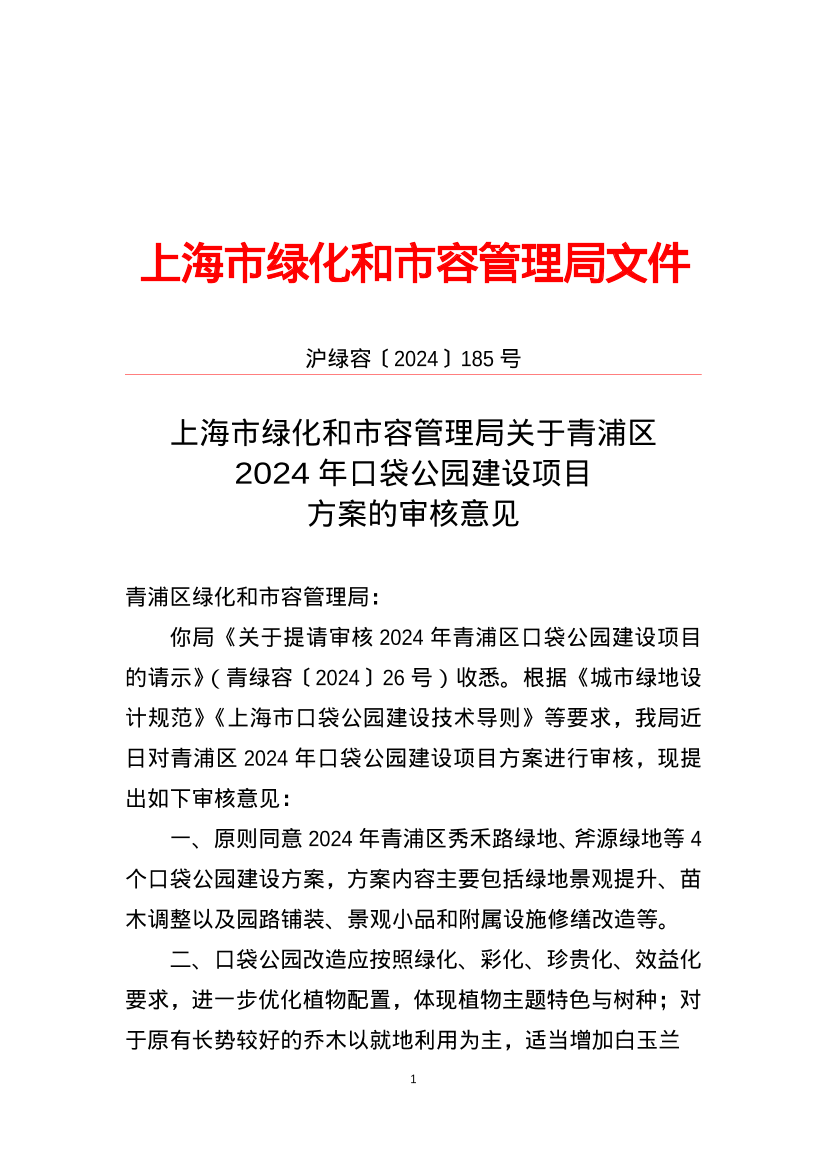 你局《关于提请审核 2024年青浦区口袋公园建设项目的请示》(青绿容〔2024〕26号)收悉。根据《城市绿地设计规范》《上海市口袋公园建设技术导则》等要求,我局近日对青浦区 2024年口袋公园建设项目方案进行审核,现提出如下审核意见: