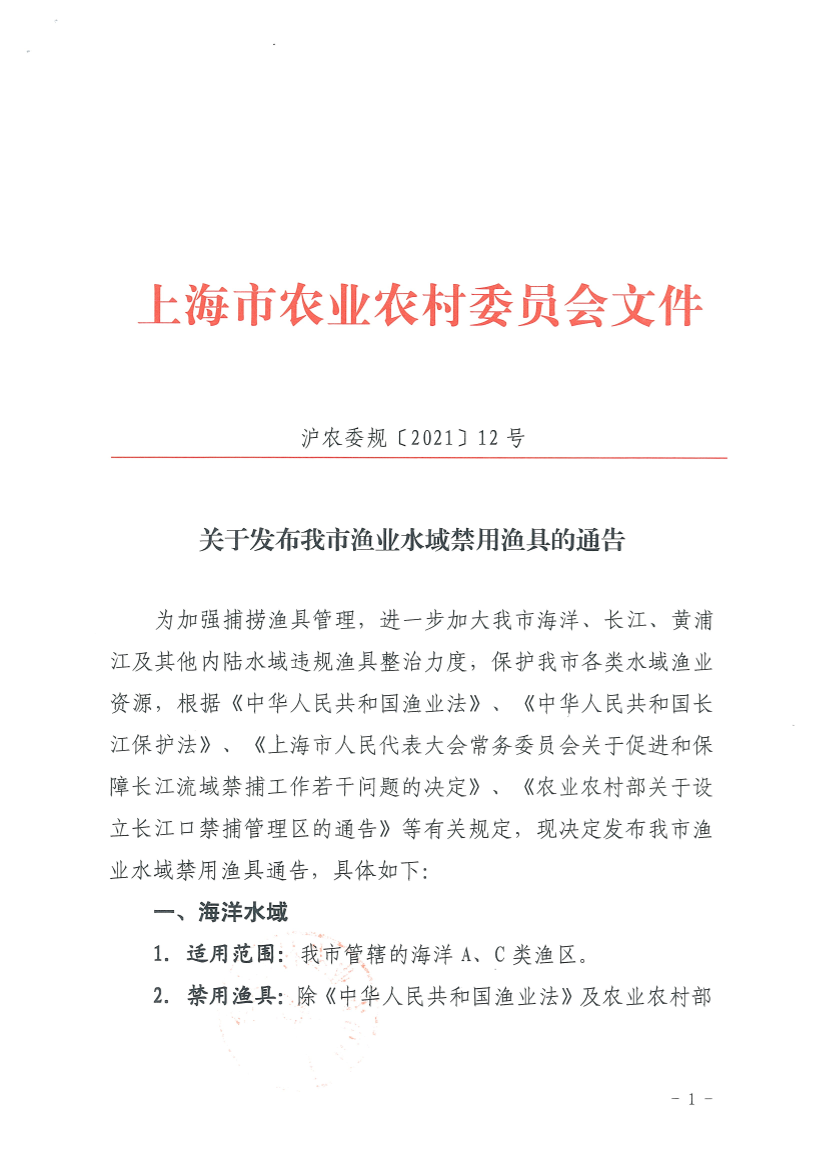 为加强捕捞渔具管理,进一步加大我市海洋、长江、黄浦江及其他内陆水域违规渔具整治力度,保护我市各类水域渔业资源,根据《中华人民共和国渔业法》、《中华人民共和国长江保护法》、《上海市人民代表大会常务委员会关于促进和保障长江流域禁捕工作若干问题的决定》、《农业农村部关于设立长江口禁捕管理区的通告》等有关规定,现决定发布我市渔业水域禁用渔具通告,具体如下:
