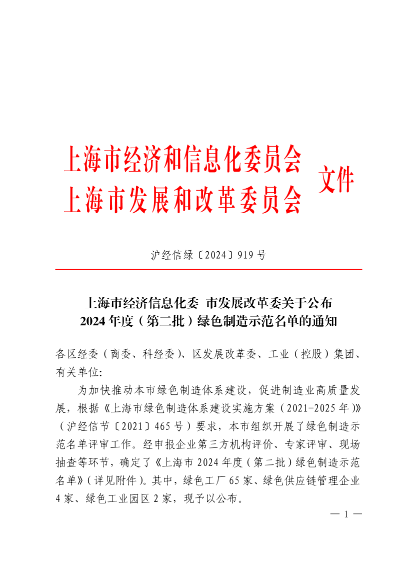 为加快推动本市绿色制造体系建设,促进制造业高质量发展,根据《上海市绿色制造体系建设实施方案(2021-2025年)》(沪经信节〔2021〕465号)要求,本市组织开展了绿色制造示范名单评审工作。经申报企业第三方机构评价、专家评审、现场抽查等环节,确定了《上海市2024年度(第二批)绿色制造示范名单》(详见附件)。其中,绿色工厂65家、绿色供应链管理企业4家、绿色工业园区2家,现予以公布。