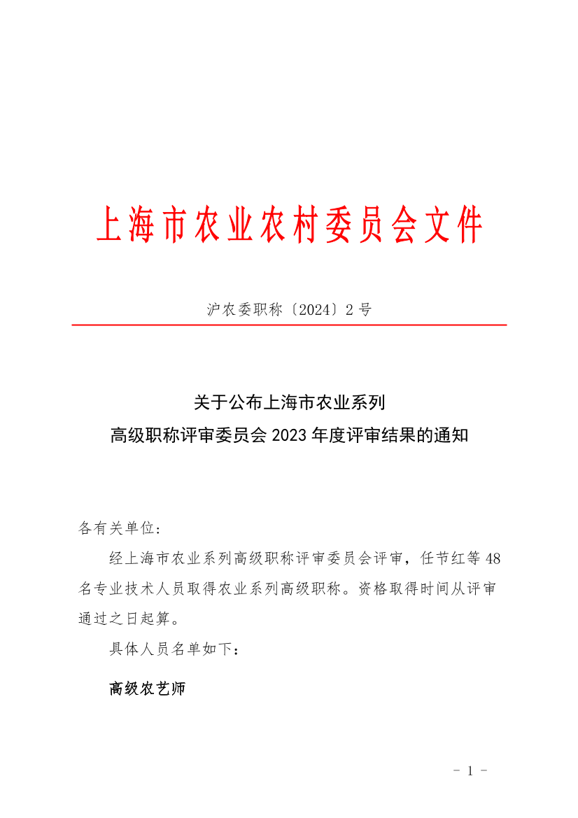 经上海市农业系列高级职称评审委员会评审,任节红等48名专业技术人员取得农业系列高级职称。资格取得时间从评审通过之日起算。