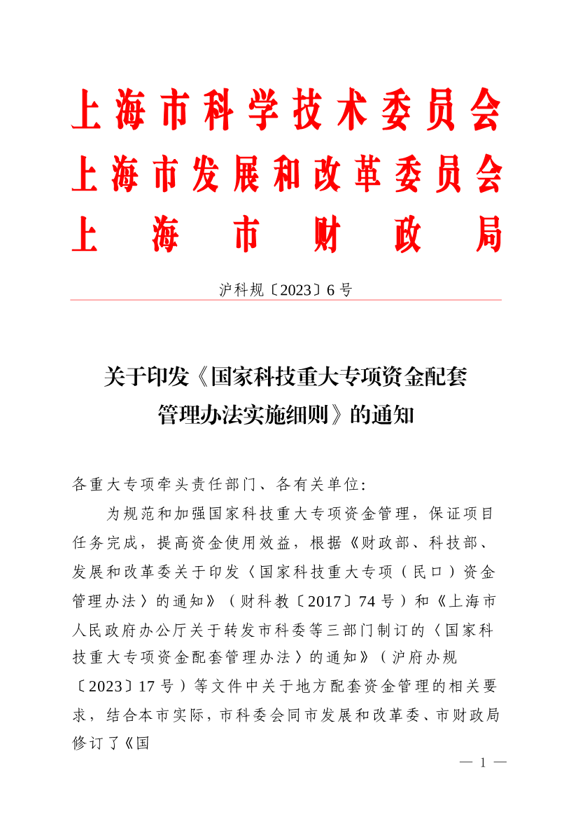 为规范和加强国家科技重大专项资金管理,保证项目任务完成,提高资金使用效益,根据《财政部、科技部、发展和改革委关于印发〈国家科技重大专项(民口)资金管理办法〉的通知》(财科教〔2017〕74号)和《上海市人民政府办公厅关于转发市科委等三部门制订的〈国家科技重大专项资金配套管理办法〉的通知》(沪府办规〔2023〕17号)等文件中关于地方配套资金管理的相关要求,结合本市实际,市科委会同市发展和改革委、市财政局修订了《国家科技重大专项资金配套管理办法实施细则》,现予印发,请遵照执行。