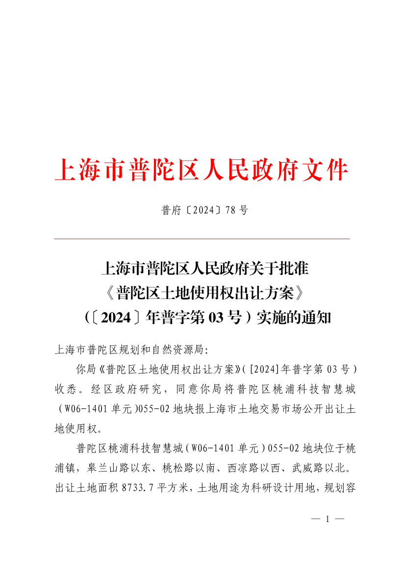 你局《普陀区土地使用权出让方案》([2024]年普字第03号)收悉。经区政府研究,同意你局将普陀区桃浦科技智慧城(W06-1401单元)055-02地块报上海市土地交易市场公开出让土地使用权。