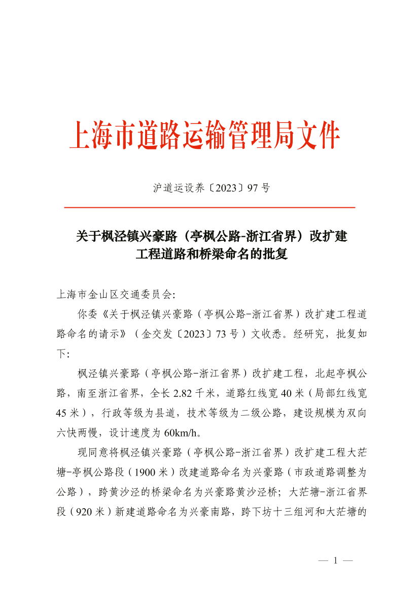 你委《关于枫泾镇兴豪路(亭枫公路-浙江省界)改扩建工程道路命名的请示》(金交发〔2023〕73号)文收悉。经研究,批复如下: