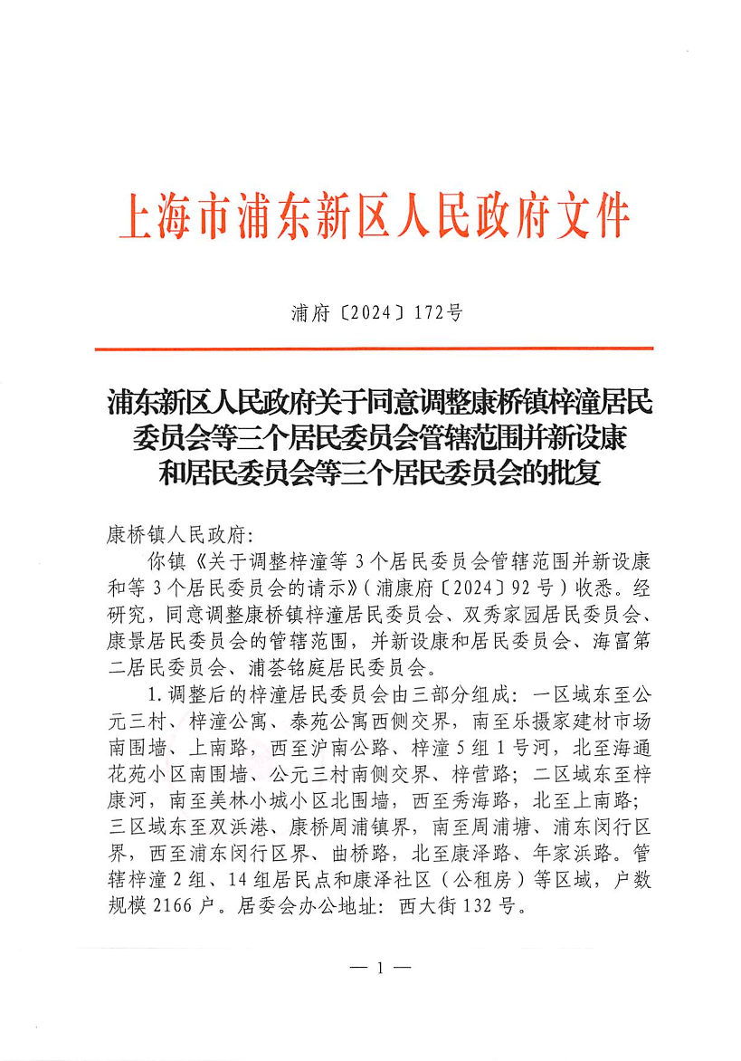 你镇《关于调整梓潼等3个居民委员会管辖范围并新设康和等3个居民委员会的请示》(浦康府〔2024〕92号)收悉。经研究,同意调整康桥镇梓潼居民委员会、双秀家园居民委员会、康景居民委员会的管辖范围,并新设康和居民委员会、海富第二居民委员会、浦荟铭庭居民委员会。