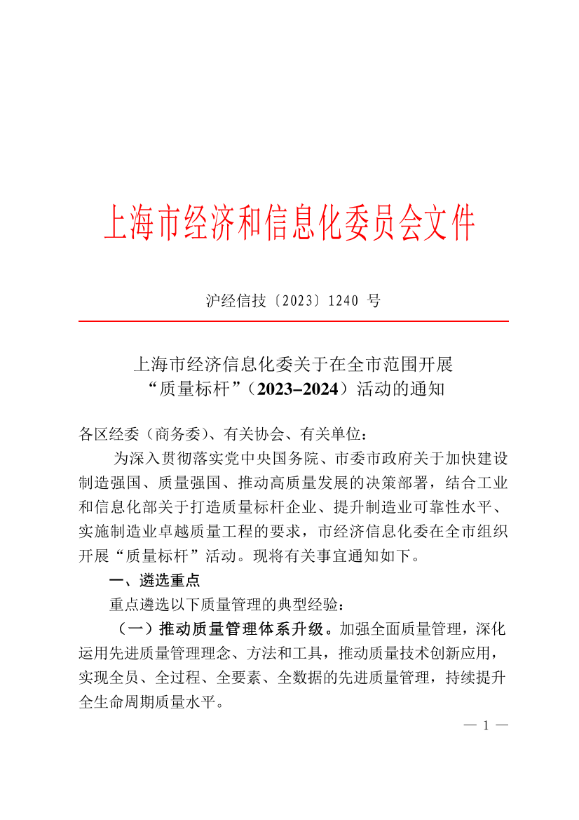 为深入贯彻落实党中央国务院、市委市政府关于加快建设制造强国、质量强国、推动高质量发展的决策部署,结合工业和信息化部关于打造质量标杆企业、提升制造业可靠性水平、实施制造业卓越质量工程的要求,市经济信息化委在全市组织开展“质量标杆”活动。现将有关事宜通知如下。