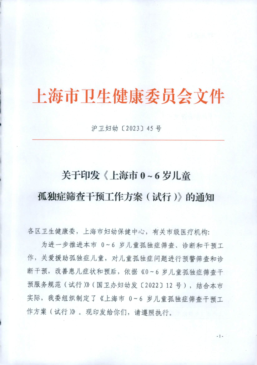 上海市0~6岁儿童孤独症筛查干预工作方案(试行)
