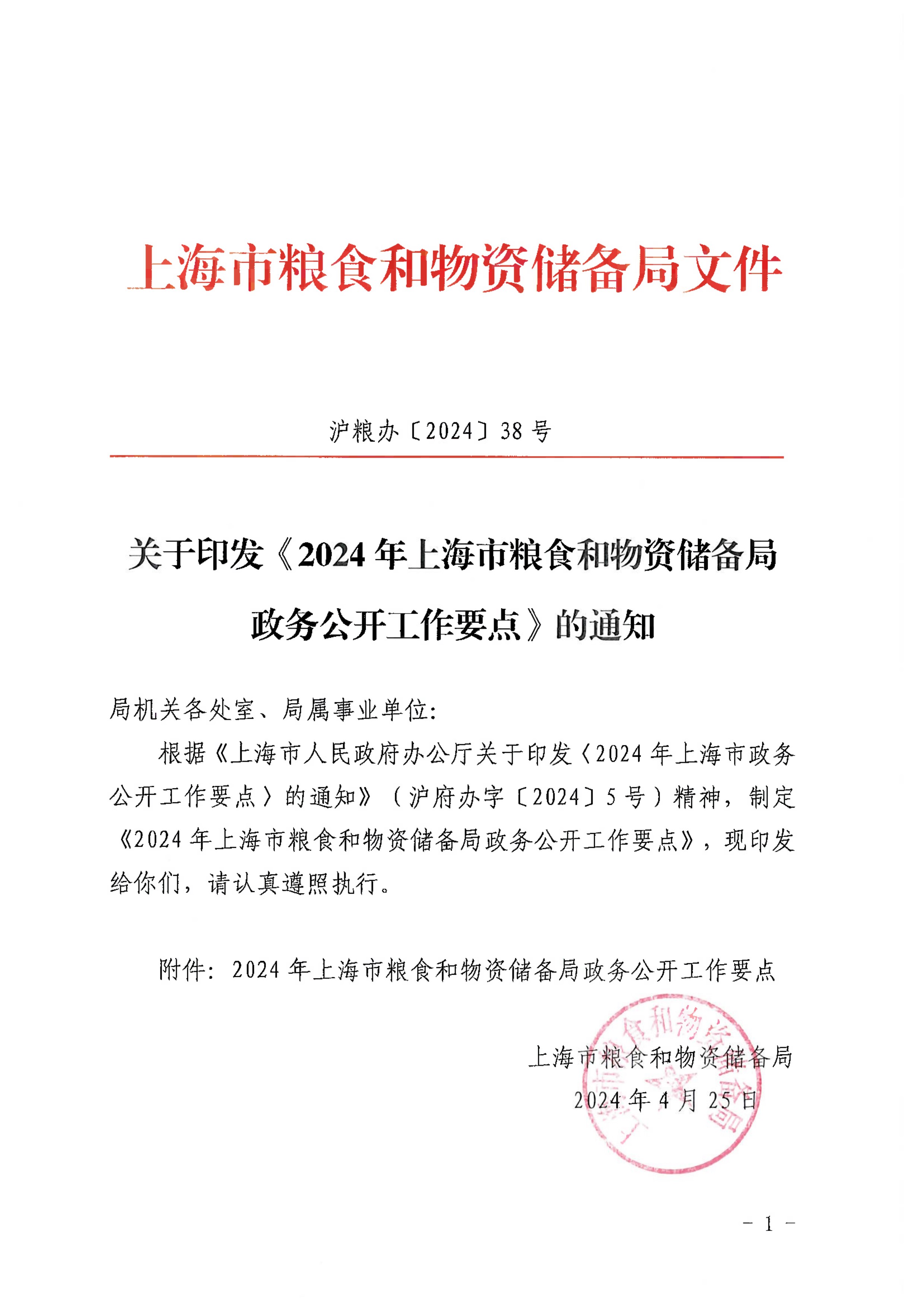 根据《上海市人民政府办公厅关于印发〈2024年上海市政务公开工作要点〉的通知》(沪府办字〔2024〕5号)精神,制定《2024年上海市粮食和物资储备局政务公开工作要点》,现印发给你们,请认真遵照执行。